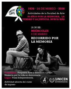 En el marco de los 50 años del Golpe de Estado en Argentina, la Facultad de Arte desarrolla durante el mes de marzo una serie de actividades que invitan a reflexionar el arte en la construcción de memoria, la reflexión crítica y la defensa de la democracia.