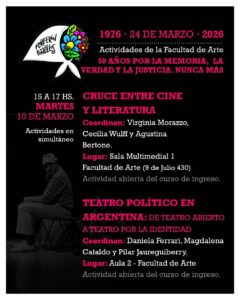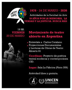 En paralelo, en el Aula 2, se desarrollará la actividad “Teatro político en Argentina: de Teatro Abierto a Teatro por la Identidad”, coordinada por Daniela Ferrari, Magdalena Cataldo y Pilar Jaureguiberry, que abordará distintas experiencias del teatro argentino vinculadas a la memoria y la defensa de los derechos humanos.