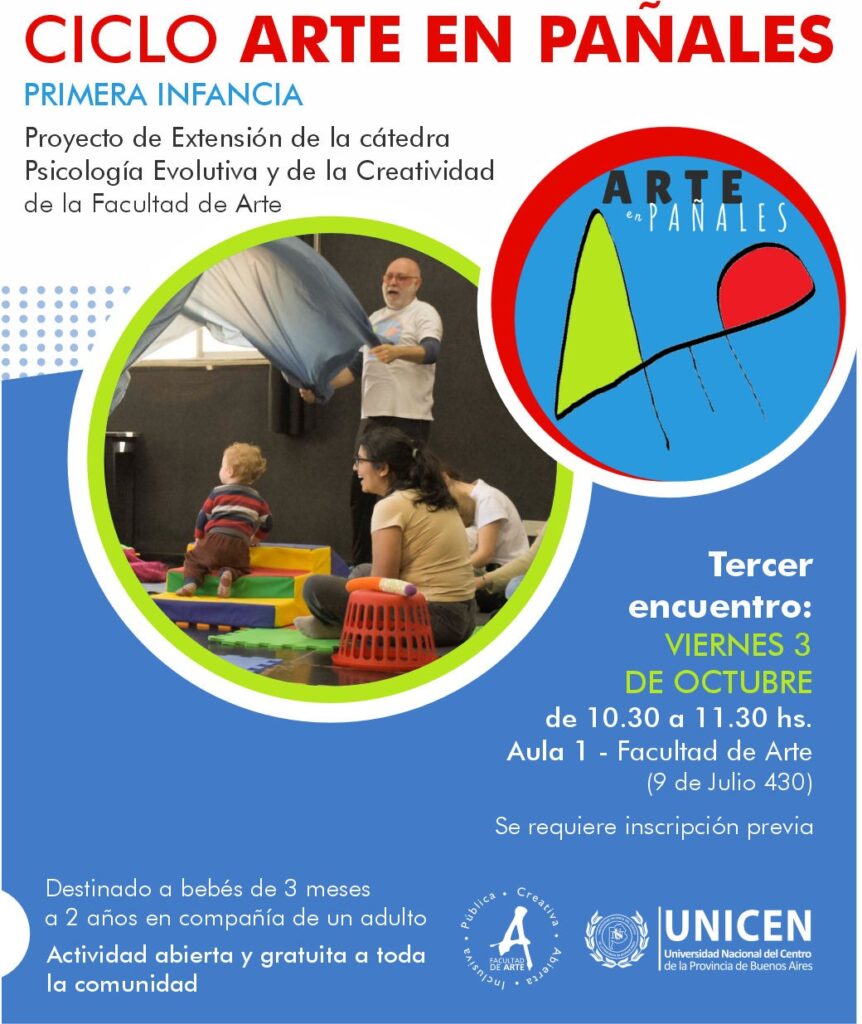 El Proyecto de Extensión “Arte en Pañales. Primera escena”, propuesta diseñada para que bebés y adultos compartan experiencias artísticas especialmente diseñadas para ellxs, estará desarrollando una nueva jornada de encuentro el viernes 3 de octubre de 10.30 a 11.30hs. en el aula 1 de la sede de la Facultad de Arte –9 de Julio 430-. Se trata de un taller vivencial destinado a bebés de 3 a 24 meses acompañadxs por un adultx.