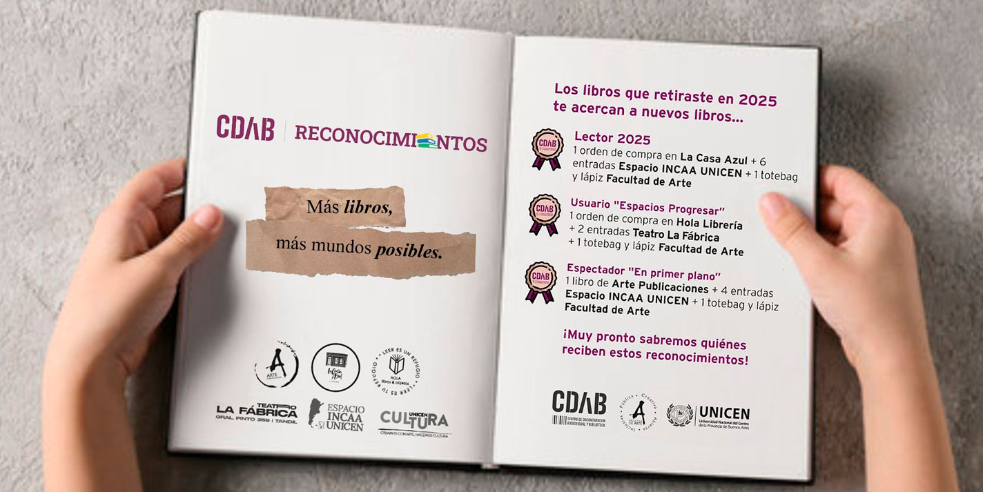 Con el objetivo de promover la lectura, la formación académica, la investigación y el pensamiento crítico-reflexivo sobre la práctica artística, compromisos constantes del Centro de Documentación Audiovisual y Biblioteca (CDAB) de la Facultad de Arte, regresan los RECONOCIMIENTOS CDAB. Mediante esta iniciativa impulsada por primera vez en diciembre de 2023 se otorgan 3 (tres) distinciones a quienes se involucran activamente en el espacio. Este año, además del retiro de libros en calidad de préstamo domiciliario, se distinguirá la utilización del área de trabajo “Espacios Progresar” y el acompañamiento al ciclo “en primer plano”.