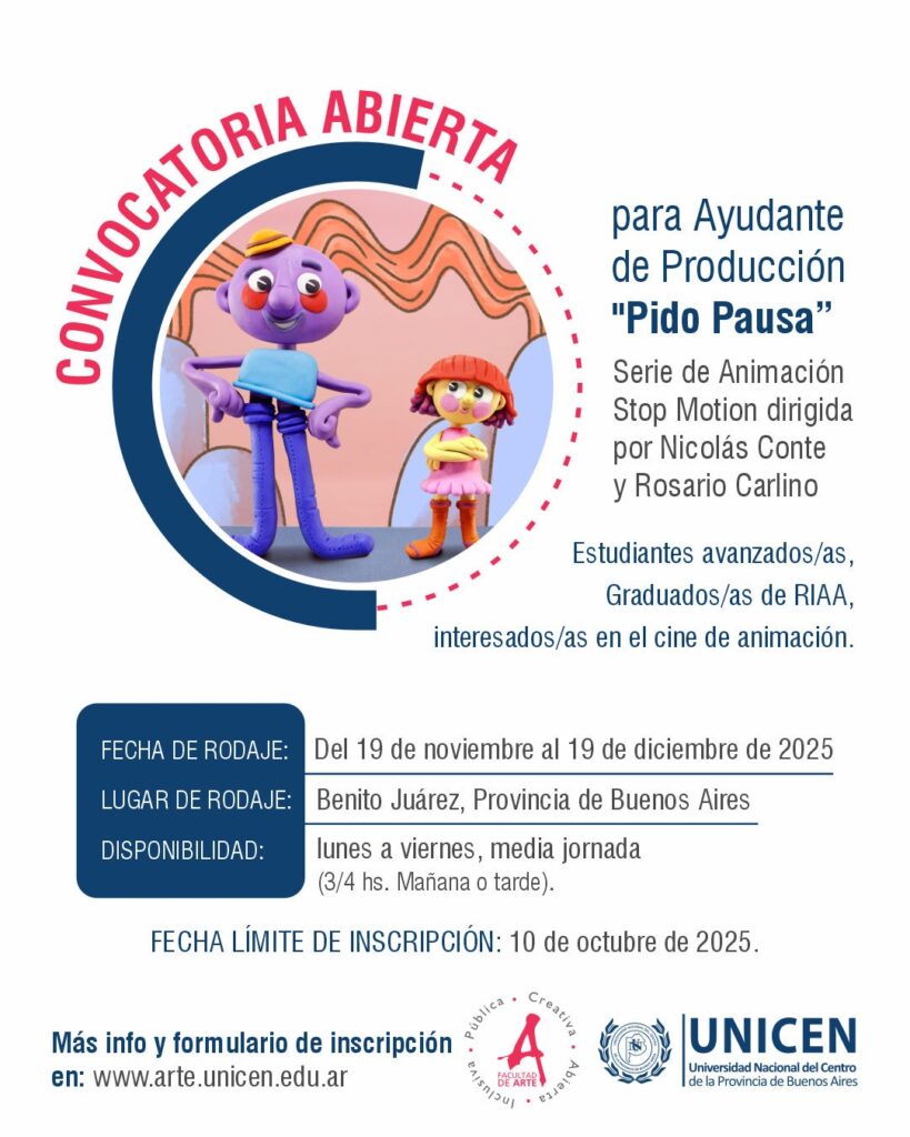 La Facultad de Arte invita a estudiantes avanzados/as y graduados/as de la carrera de Realización Integral en Artes Audiovisuales (RIAA) a postularse como Ayudante de Producción para integrar el equipo técnico de la serie de animación en stop motion Pido Pausa, dirigida por Nicolás Conte y Rosario Carlino, co-producida entre Osa Estudio (Argentina) y Sardinha em Lata (Portugal).