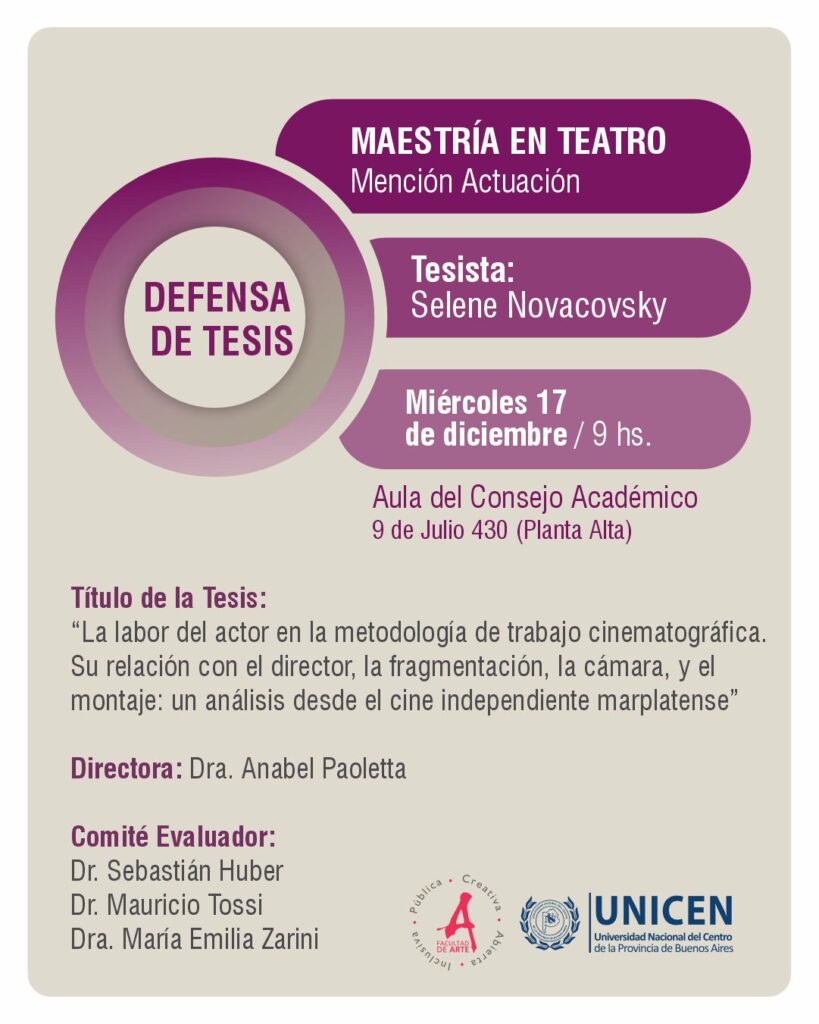 El miércoles 17 de diciembre a las 9hs se llevará a cabo, en el aula del Consejo Académico, la Defensa de Tesis de Selene Novacovsky, correspondiente a la Maestría en Teatro, Mención Actuación.