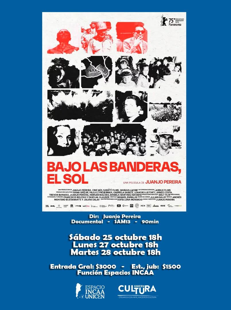 Bajo las banderas, el sol Dir: Juanjo Pereira Documental - SAM13 - 90min Sábado 25 octubre 18h Lunes 27 octubre 18h Martes 28 octubre 18h Entrada Gral: $3000 - Est., jub: $1500 Función Espacios INCAA La caída en Paraguay de la dictadura de Stroessner, en 1989, marcó también el abandono de un enorme archivo visual. Inéditas u olvidadas hasta ahora, esas imágenes vuelven para dar cuenta de cómo su manipulación permitió adoctrinar y construir un culto a su persona. Las entradas para las funciones pueden adquirirse en la boletería de la sala desde el próximo sábado en los siguientes horarios. Sábado 25 oct, lunes 27 oct y martes 28 oct de 17 a 20h.Domingo 26 oct sin funciones por elecciones nacionales. Se acepta pago con débito o Qr. El Espacio INCAA UNICEN depende del Área de Cultura de la UNCPBA y funciona en el Auditorium del Centro Cultural Universitario (Yrigoyen…