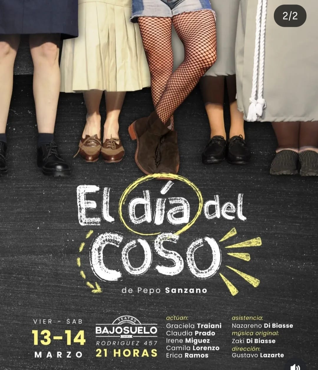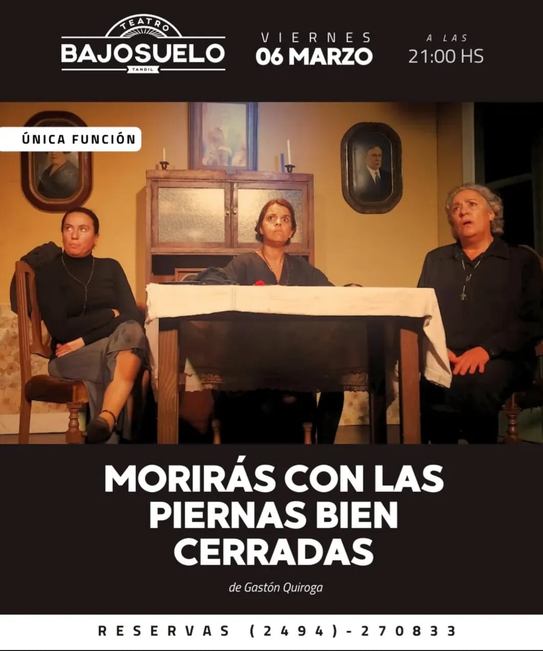 🔥 MORIRÁS CON LAS PIERNAS BIEN CERRADAS La comedia histórica de Tandil. Récord absoluto de funciones y público desde su estreno en 2012. Una obra que ya es un clásico… y los clásicos no envejecen: se afilan. Escrita por Gastón Quiroga, con asistencia de Nazareno Di Biasse, dirigida por Gustavo Lazarte, e interpretada por Gabriela Weber, Mariana Cherjovsky y Yanina López, llega con toda su ironía, su inteligencia y ese humor incómodo que te hace reír… y pensar. Una noche. Una historia. Tres mujeres en escena que no se guardan nada. 📅 Viernes 06 de marzo – 21 hs 📍 ÚNICA FUNCIÓN en BAJOSUELO Si la viste, sabés por qué vuelve. Si no la viste… esta es tu oportunidad. Nos vemos en la sala. 🔥🎭