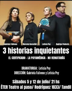 3 HISTORIAS INQUIETANTES se presentará el Sábado 12 de julio a las 21 hs. en Éter teatro al paso (Rodríguez 1033)