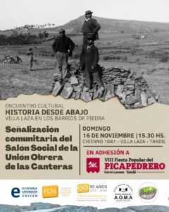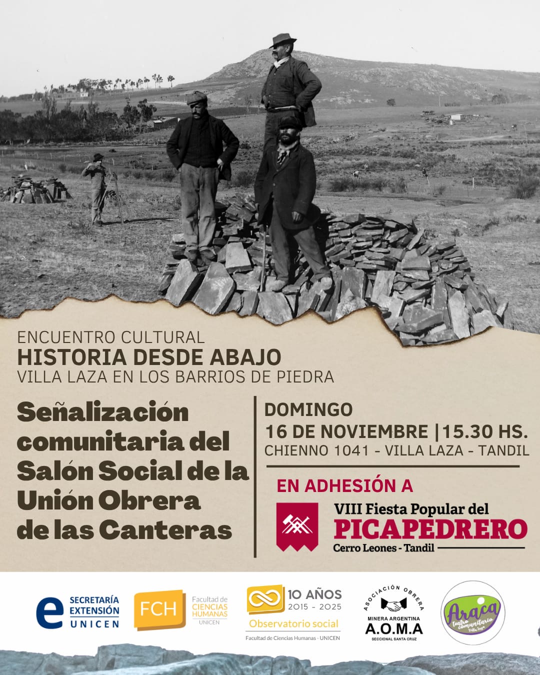 Uno de los momentos centrales será la señalización histórica del Salón Social de la Unión Obrera de las Canteras, un espacio clave en la vida y lucha del movimiento canteril desde 1911. En este salón se realizaban asambleas gremiales, actividades sociales, funciones teatrales y funcionaba una biblioteca obrera. Esta valiosa historia ha sido reconstruida de forma colectiva junto a pobladores y pobladoras, la Asociación Obrera Minera Argentina y ARACA Teatro Comunitario Villa Laza en el marco del Proyecto de Extensión “Historia desde abajo y memoria social”.