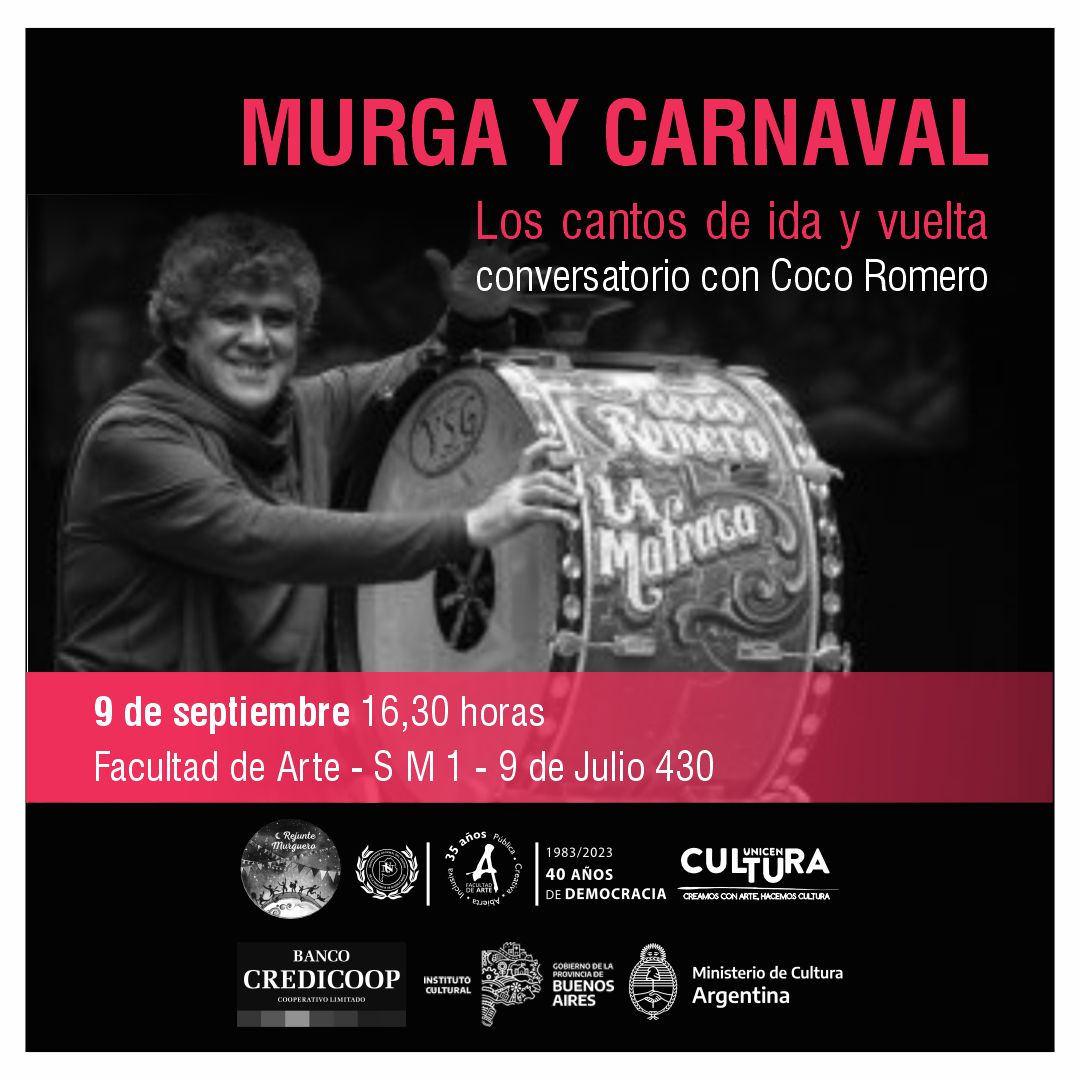 Sábado 9 de septiembre , 16:30hs (SM1 Facultad de Arte- 9 de julio 430) Coco Romero estará  participando del Conversatorio “Murga y carnaval. Los cantos de ida y vuelta”.