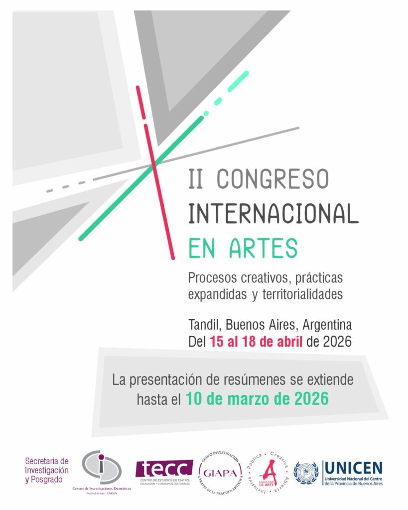 La Secretaría de Investigación y Posgrado, en conjunto con los núcleos y grupos de investigación de la Facultad de Arte, convoca al II Congreso Internacional en Artes. Procesos creativos, prácticas expandidas y territorialidades, un espacio que busca seguir construyendo instancias de diálogo e intercambio de saberes y experiencias en torno a la investigación en artes. Se desarrollará del 15 al 18 de abril de 2026 en el ciudad de Tandil.