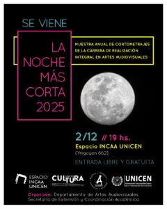 La Facultad de Arte llevó adelante una nueva edición de La Noche más Corta, el tradicional encuentro que reúne producciones realizadas en las cátedras de la carrera Realización Integral en Artes Audiovisuales. La actividad se desarrolló el martes 2 de diciembre de 2025 en la Sala INCAA UNICEN, con entrada libre y gratuita.