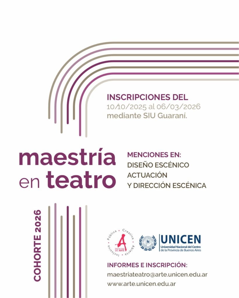 Desde el 10 de octubre de 2025 hasta el 6 de marzo de 2026 se encontrará abierto el período de inscripción para la cohorte 2026 de la Maestría en Teatro, que ofrece menciones en Diseño Escénico, Actuación y Dirección Escénica. Esta carrera de posgrado cuenta con acreditación de CONEAU y posee reconocimiento oficial con validez nacional.