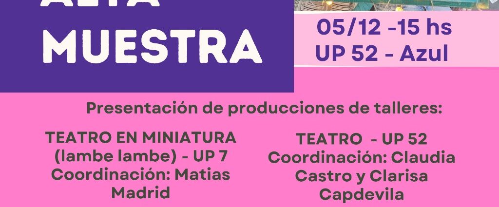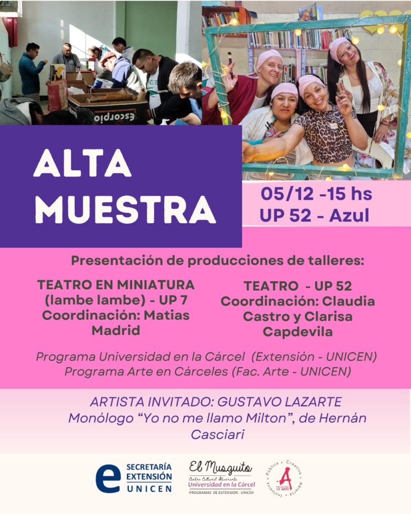 El viernes 5 de diciembre se realizará en la Unidad Penal Nº 52 de Azul la muestra anual de los talleres del Programa Arte en Cárceles, desarrollado en conjunto con el programa La Universidad en la Cárcel y el centro cultural itinerante El Musguito.