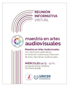 Se invita a todas las personas interesadas en conocer la propuesta de la nueva Maestría en Artes Audiovisuales a participar de una charla informativa virtual, que se realizará el Miércoles 11 de marzo, 19hs.