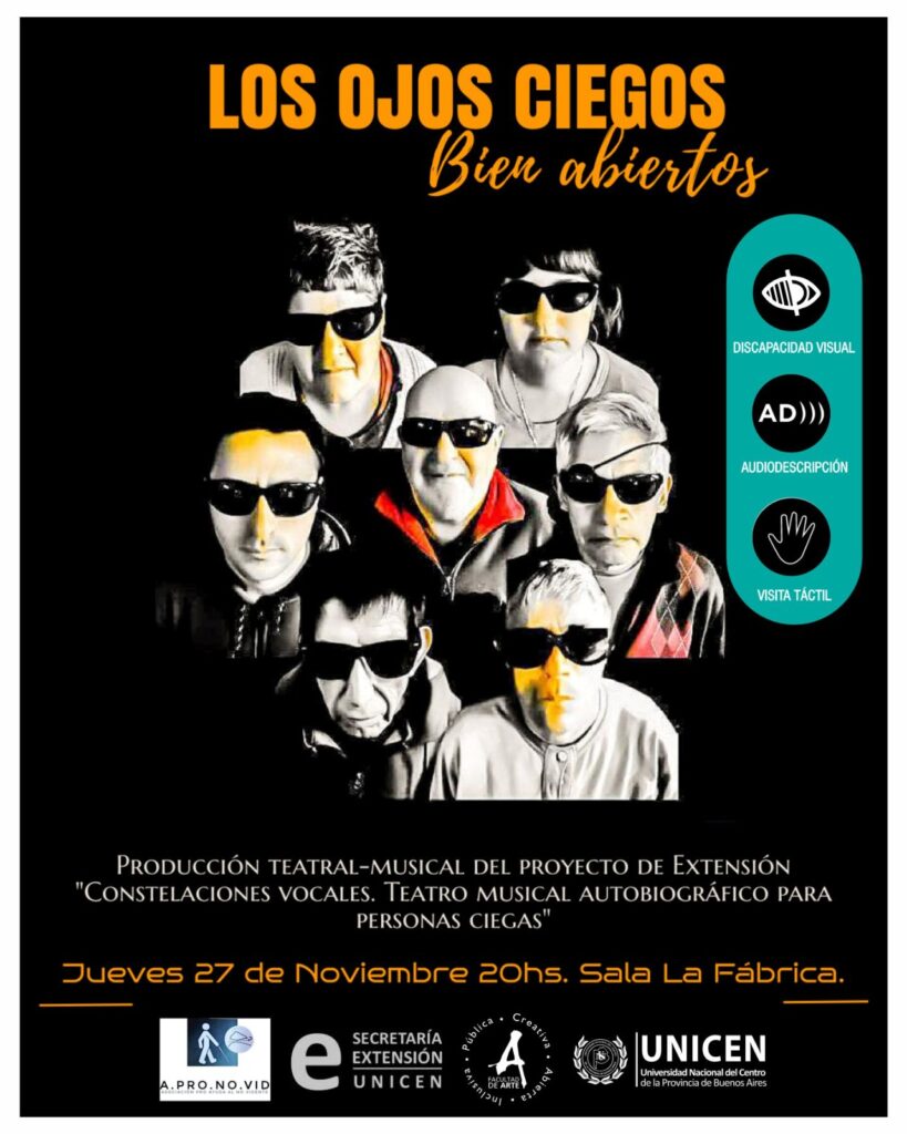 El proyecto de Extensión “Constelaciones vocales. Teatro musical autobiográfico para personas ciegas”, en articulación con APRONOVID (Asociación Pro Ayuda al No Vidente y/o personas con disminución visual), presenta la obra “Los ojos ciegos bien abiertos”.