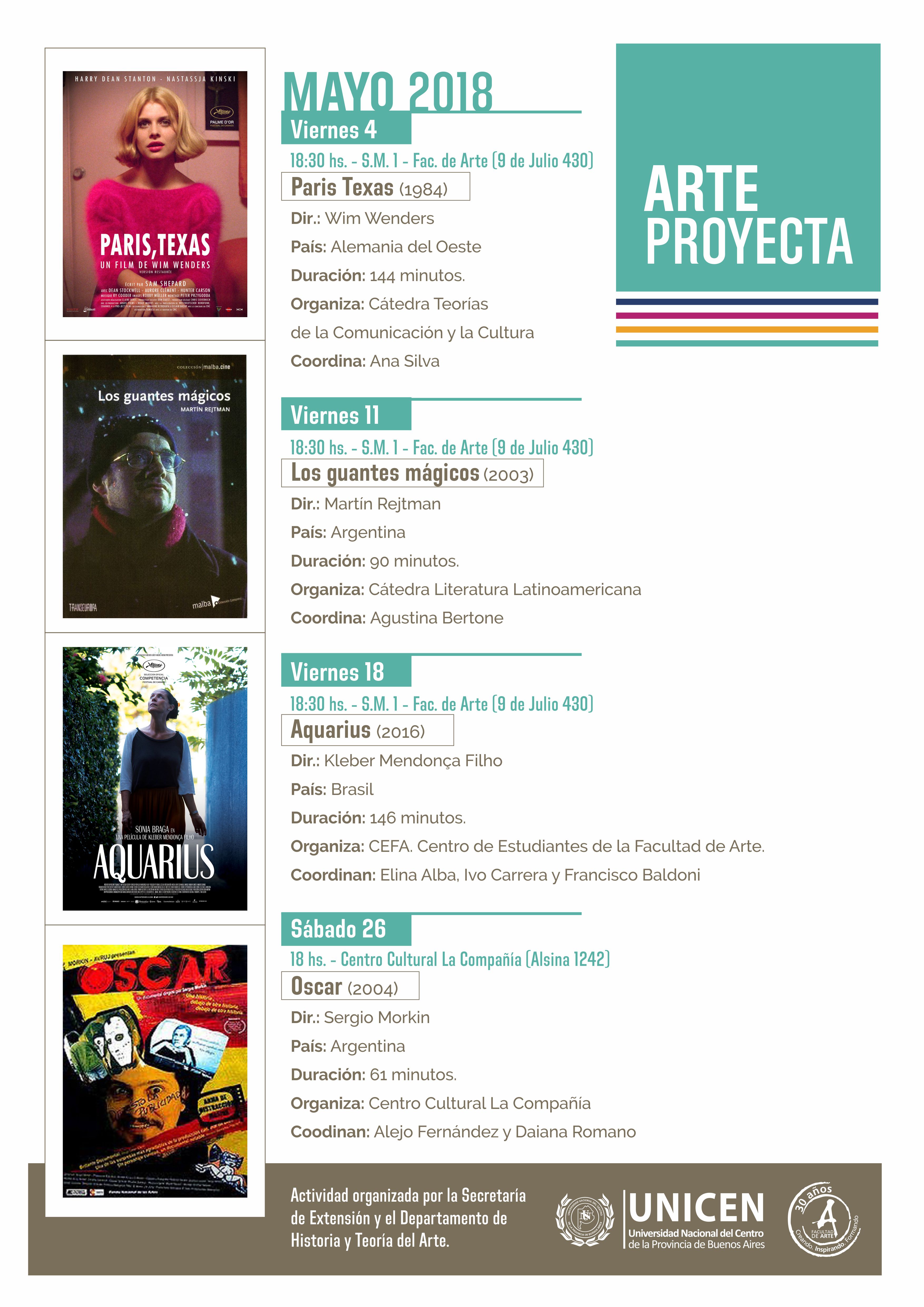 “Arte proyecta” es promovido por el Departamento de Historia y Teoría del Arte y la Secretaría de Extensión de la Facultad de Arte con el propósito de generar espacios de proyecciones abiertas y gratuitas a la comunidad. A lo largo del ciclo 2018, la programación se define con las  Cátedras de la Carrera de Realización Integral en Artes Audiovisuales, el Centro de Estudiantes de la Facultad de Arte y el Centro Cultural La Compañía, con propuestas audiovisuales diferentes cada mes.