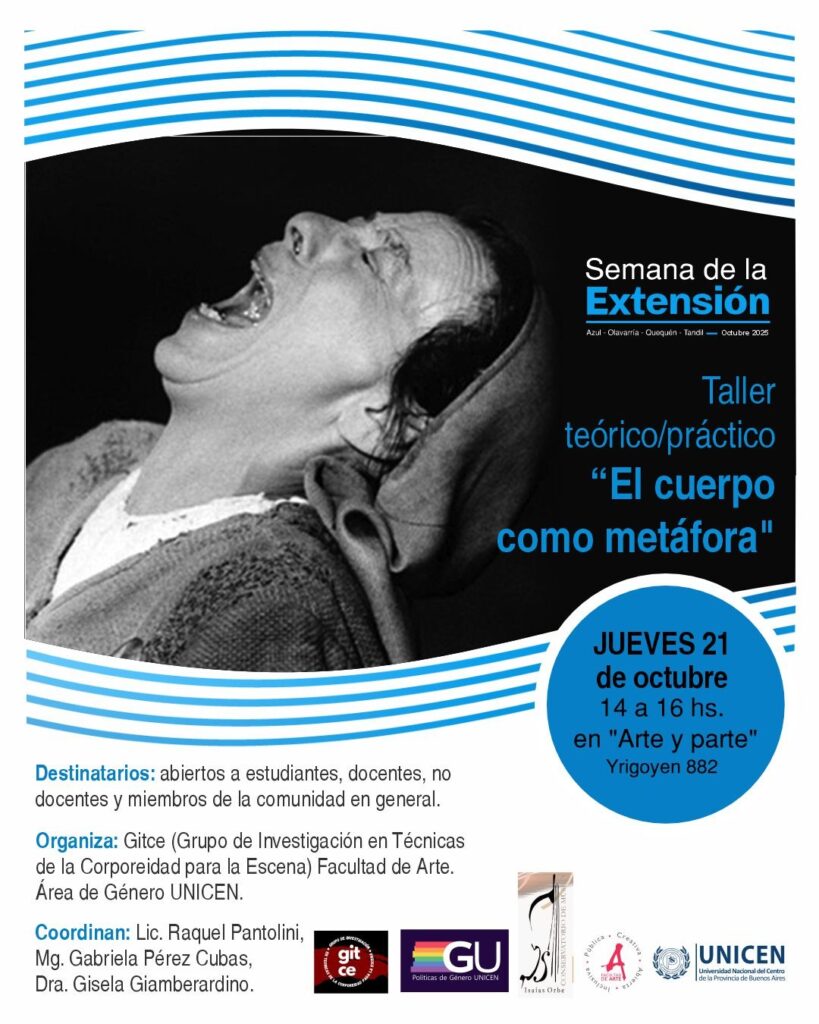En el marco de la Semana de la Extensión, invitamos a participar del taller teórico-práctico “El cuerpo como metáfora”, que se desarrollará el jueves 21 de octubre de 14 a 16 hs en el espacio “Arte y Parte”, ubicado en Yrigoyen 882.