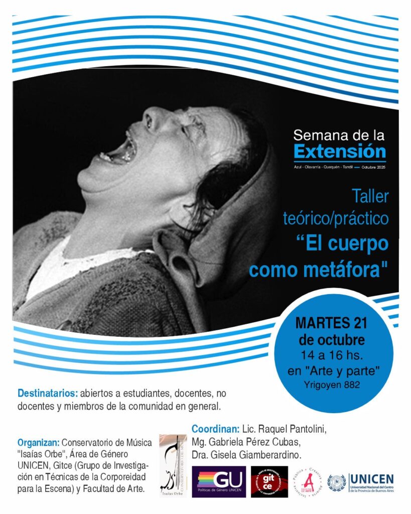 El taller es organizado por el GITCE (Grupo de Investigación en Técnicas de la Corporeidad para la Escena) de la Facultad de Arte, en articulación con el Área de Género de la UNICEN y el Conservatorio de Música “Isaías Orbe”.