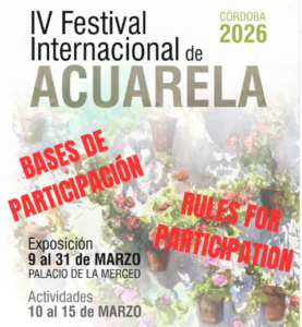 CONVOCATORIA ABIERTA PARA EL IV FESTIVAL INTERNACIONAL DE ACUARELA CÓRDOBA 2026 Se invita a ser parte de la exposición y concurso con tu obra de acuarela original. CIERRE: 30 de Noviembre de 2025 |