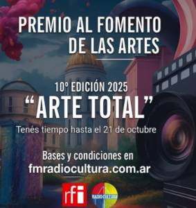 CONVOCATORIA “ARTE TOTAL” Ya está abierta la convocatoria a la 10° edición del Premio RFI – Radio Cultura al Fomento de las Artes. En esta edición, se seleccionaran obras que integren al menos tres disciplinas artísticas reconocidas en instancias anteriores del Premio: Artes Escénicas, Artes Visuales, Danza, Fotografía, Cine, Street Art, Música, Literatura, Performance y Creación Digital. CIERRE: 21 de Octubre de 2025 |