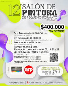 12º SALÓN DE PINTURA DE PEQUEÑO FORMATO La Asociación Riocuartense de Plásticos junto a la Comisión de Asociados de la Filial Río Cuarto Con temática libre, se aceptarán obras comprendidas en todas las expresiones dentro del campo de la pintura. CIERRE: 28 de Octubre de 2025 |