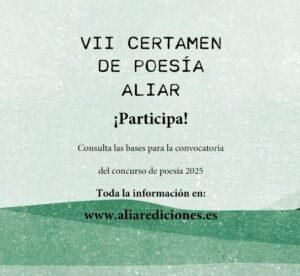 VII CERTAMEN DE POESÍA ALIAR Aliar Ediciones procede a anunciar la convocatoria del séptimo concurso de poesía, en orden al cumplimiento de objetivos de difusión y divulgación cultural, apoyo a nuevos y no tan nuevos autores y generación de una plataforma de comunicación que sirva, ante todo, para dar a conocer la inmensa riqueza literaria que abunda en nuestro idioma castellano. CIERRE: 20 de Diciembre de 2025 |