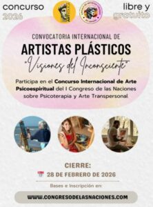 CONVOCATORIA INTERNACIONAL DE ARTISTAS PLASTICOS “VISIONES DEL INCONSCIENTE” Concurso Internacional del Arte Psicoespiritual en el marco del I Congreso de las Naciones sobre Psicoterapia y Arte Transpersonal. El certamen busca destacar aquellas imágenes que logren expresar la profundidad del alma humana y su vínculo con la transformación interior. CIERRE: 28 de Febrero 2026 |