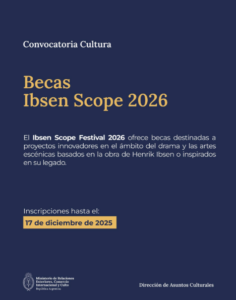 CONVOCATORIA CULTURA Las becas Ibsen son subvenciones bienales destinadas a proyectos innovadores en el ámbito del drama y las artes escénicas. Se otorgan en el marco del Ibsen Scope Festival 2026 de Noruega. CIERRE: 17 de Diciembre de 2025 |