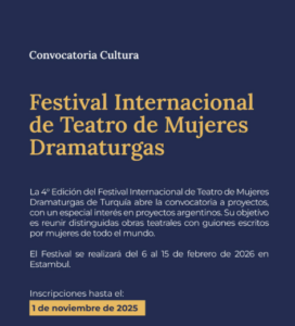 FESTIVAL INTERNACIONAL DE TEATRO DE MUJERES DRAMATURGAS El Festival Internacional de Teatro de Mujeres Dramaturgas celebrará su cuarta edición, del 6 al 15 de febrero de 2026 en la ciudad de Estambul. Su objetivo es reunir distinguidas obras teatrales con guiones escritos por mujeres de todo el mundo, con un especial interés en la participación argentina. CIERRE: 1 de Noviembre de 2025 Por dudas o consultas: istwomenplaywrightsfest@gmail.com |