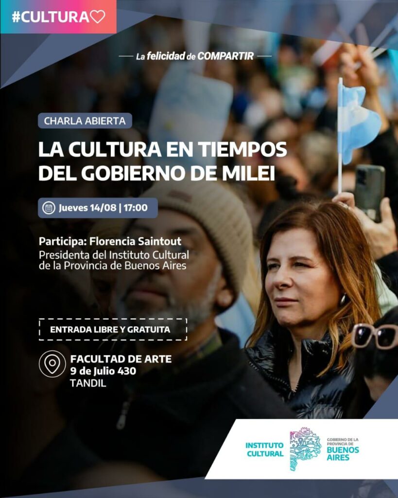 Además, en el marco de su visita, Florencia Saintout ofrecerá una charla abierta titulada “La cultura en tiempos del actual gobierno nacional”, destinada a trabajadores y trabajadoras de las artes y la cultura, así como al público interesado en la temática.