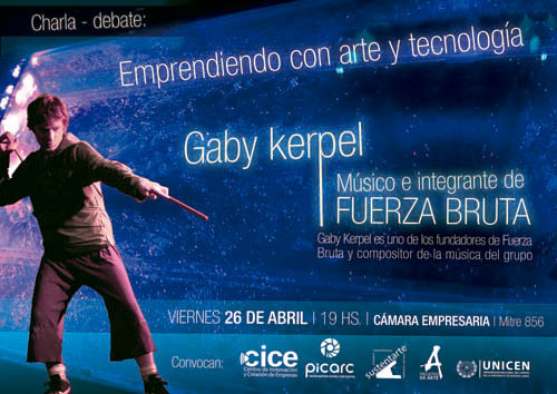 En el marco de la exposición “Emprendiendo con Arte y Tecnología”, se presenta Gaby Kerpel, uno de los fundadores de Fuerza Bruta y compositor de toda la música de esta agrupación artística.
