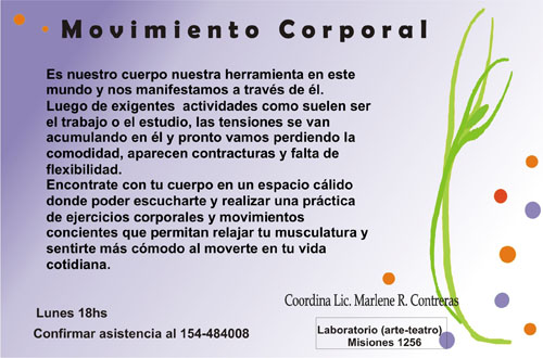 A partir del lunes 15 de abril comenzará el taller de Movimiento Corporal en este nuevo espacio, quienes estén interesados deberán confirmar asistencia por este medio o teléfono 154 484008.