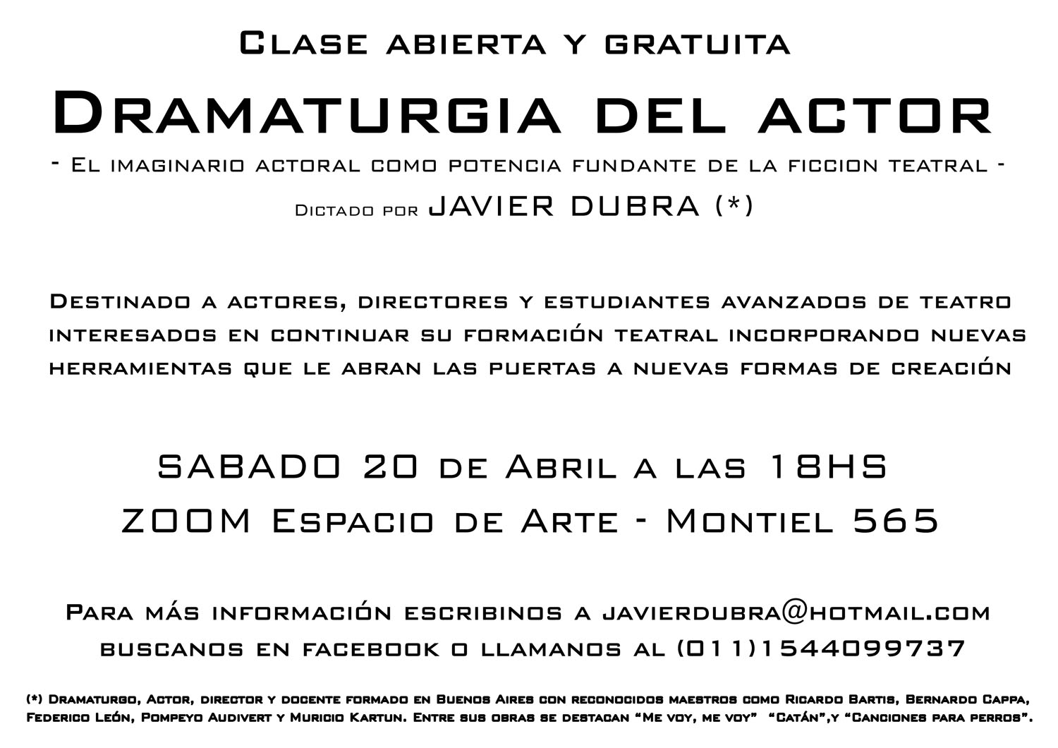 Para aquellos que estén interesados, se organizará una reunión mensual por fuera de los encuentros para discutir aspectos teóricos de la actuación y la dirección, basado en un dosier de autores del área teatral y artística en general.