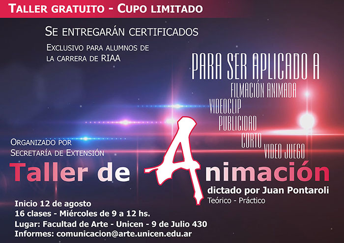 Abierta la inscripción para participar del Taller de Animación que estará a cargo del docente Juan Pontaroli. La propuesta educativa se iniciará el miércoles 12 de agosto y contará con un programa de 16 clases, todos los miércoles de 9 a 12hs. Adobe Flash será la plataforma de aprendizaje.