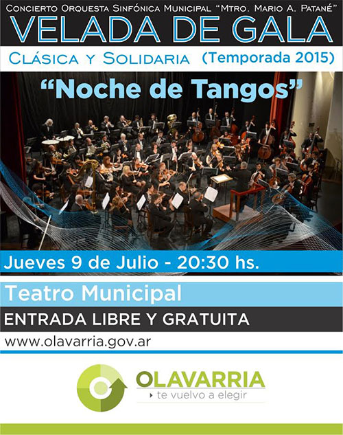 Junto al mtro. Oscar de Elía (piano), Horacio Romo (bandoneón), las voces de Florencia, Marina y Mario Bellomo, la pareja de tango "Marta y Raúl" y el Ballet infanto juvenil municipal de Tango y Folklore a partir de 20,30 hs. En el Teatro Municipal de Olavarrí con entrada libre y gratuita