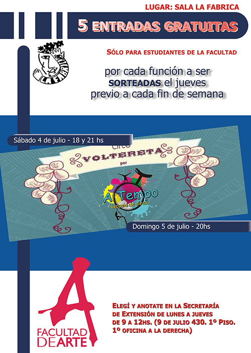 Desde la Secretaría de Extensión se brindarán 5 entradas gratis para el espectáculo en la Sala La Fábrica: Circo Voltereta: sábado 4, 18 y 21 hs. y domingo 5, 20hs.