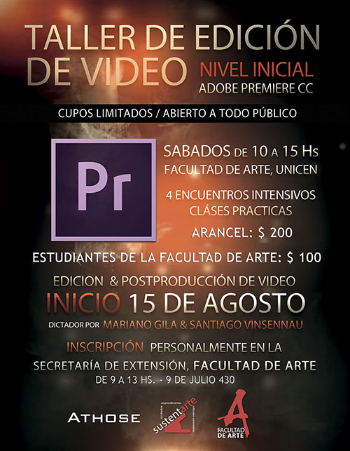 DESCRIPCIÓN DEL TALLER: Adobe Premiere CC es una aplicación profesional de de edición de video. A través de este taller intensivo se abordará un acercamiento a la interfaz y a las herramientas que ofrece el programa. El participante aprenderá a realizar un conjunto de operaciones que le permitirán conocer los fundamentos de la edición no lineal y las herramientas básicas necesarias para realizar proyectos en el área como: importación, edición de clips, ajustes de exposición y color, escalado y exportación. Asimismo se abordarán algunos conceptos básicos de workflow y postproducción de video digital.