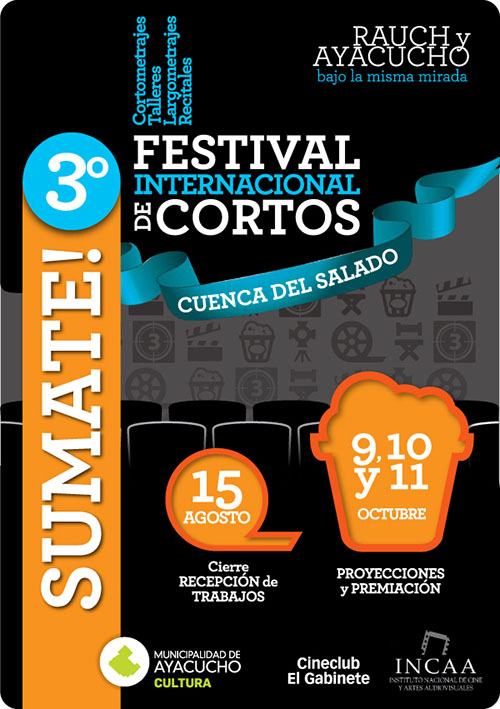 El 3º Festival Internacional de Cortos de la Cuenca del Salado que organizan en conjunto el Cineclub "El Gabinete" de Rauch y la Dirección de Cultura de la Municipalidad de Ayacucho, avanza en la recepción de trabajos que finalizará el próximo 15 de agosto.