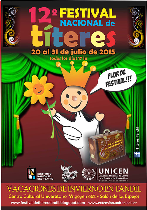 En el marco de 12º Festival Nacional de Títeres en Tandil (del 20 al 31 de julio), se realizará el Taller “Umbral de un Oficio” una propuesta teórico-práctica de introducción al mundo del Teatro de Titeres (introducción teórica y movimiento- manipulacion de diferentes técnicas) el día martes 21 de julio de 19 a 21hs. en el Salón de los Espejos (UNICEN).