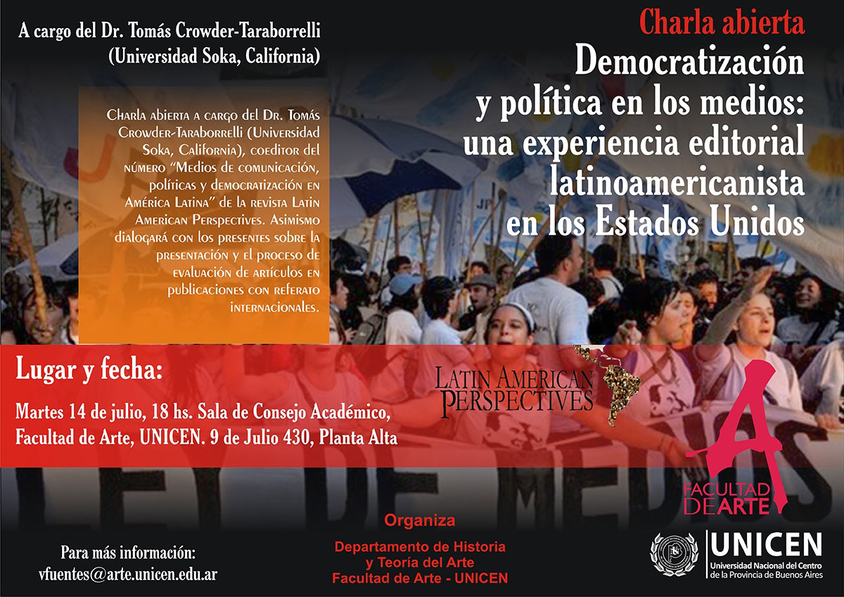 Charla abierta: "Democratización y política en los medios: una experiencia editorial latinoamericanista en los Estados Unidos" a cargo del Dr. Tomás Crowder-Taraborrelli (Universidad Soka, California)