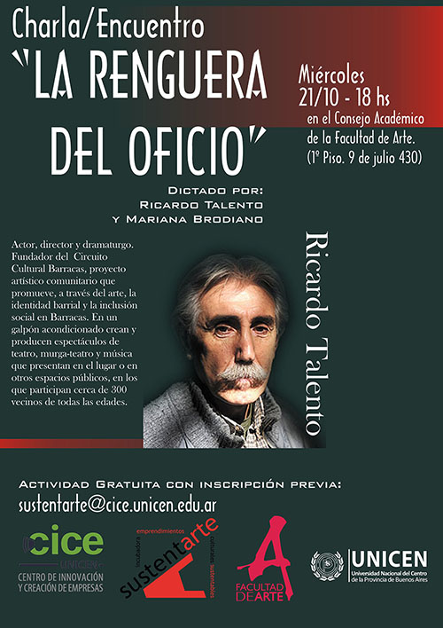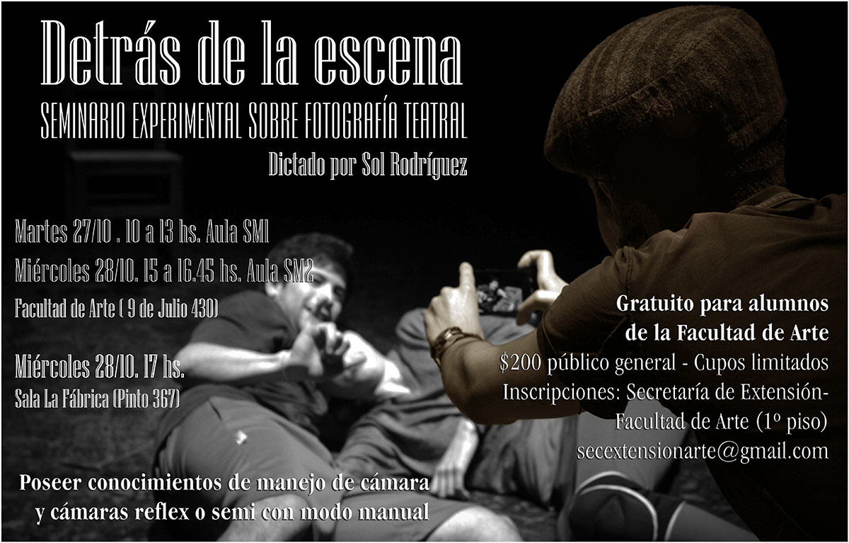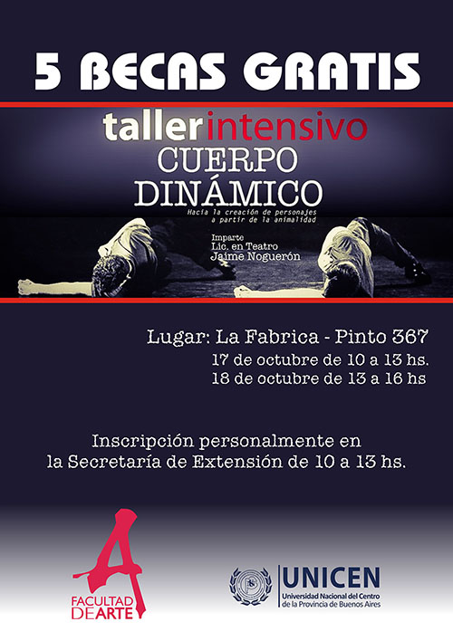Para alumnos de la Facultad de Arte se otorgará una (1) beca completa para realizar el Taller. Los/as interesados/as inscribirse personalmente en la Secretaría de Extensión de la Facultad de Arte (planta alta, subiendo las escaleras, primera oficina a la derecha) de 10 a 13 horas.