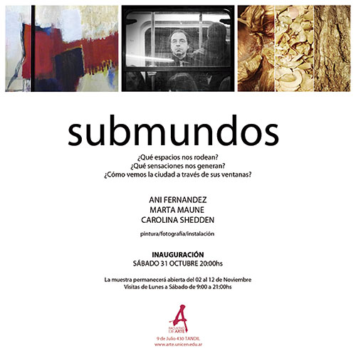 Así, tomando como hilo conductor esta estrategia, las artistas Ani Fernández, Carolina Shedden y Marta Maune nos plantean una re-mirada de esos espacios cotidianos, expresándolos desde sus entornos próximos: metrópolis, ciudad y campo, a partir de la pintura, la fotografía y la instalación, completando ese diálogo con la participación activa del público. Ani Fernández lo hace desde la plástica, donde utilizando el acrílico y el óleo, nos sumerge en sensaciones de formas, colores y texturas. Carolina Shedden utiliza fotografías en blanco y negro, capturando la inmediatez de lo urbano en una metrópolis como Buenos Aires y; Marta Maune (identificada con el paisaje) en conjunto con las otras dos artistas realiza una instalación utilizando materiales y objetos de deshecho.